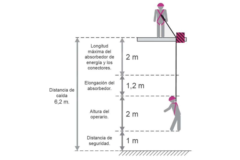 - Elemento de conexión: Puede ser una línea de vida con absorbedor de energía, un retráctil (línea de vida autorretráctil) o un cable de anclaje. Su función es unir el arnés al punto de anclaje. Los absorbedores de energía son cruciales para reducir la fuerza del impacto sobre el cuerpo del trabajador durante la detención.