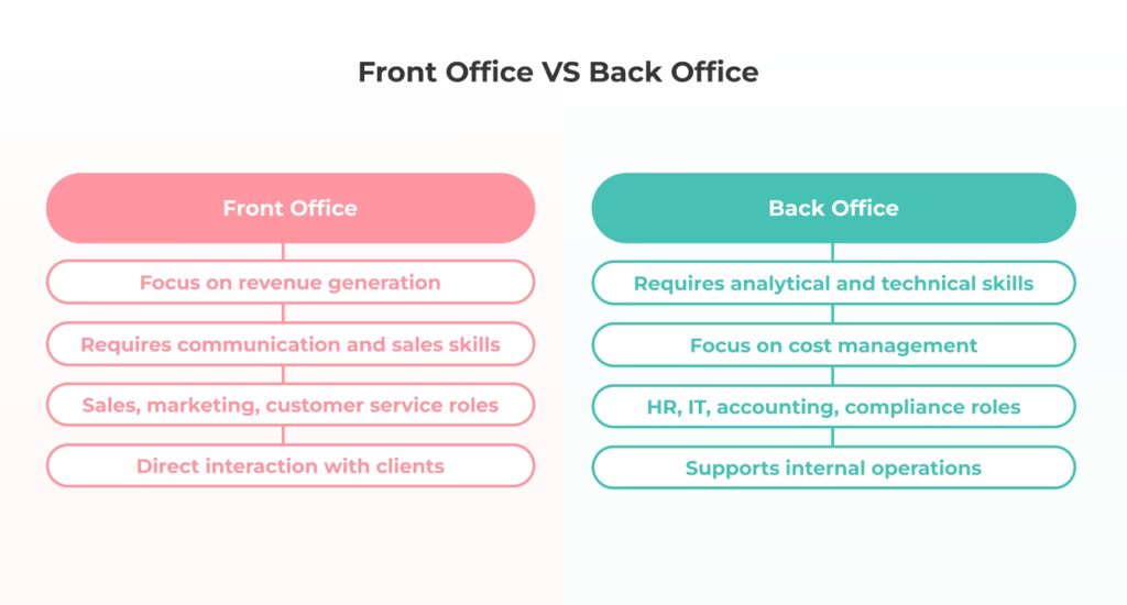 Dependiendo de la empresa o la industria, el personal del back office también puede aportar su experiencia en áreas como contabilidad, finanzas, tecnología de la información y desarrollo. Aunque no interactúan con los clientes de la empresa, sí lo hacen con quienes trabajan en el front office, lo que subraya la necesidad de habilidades de comunicación y colaboración efectivas dentro de este entorno.