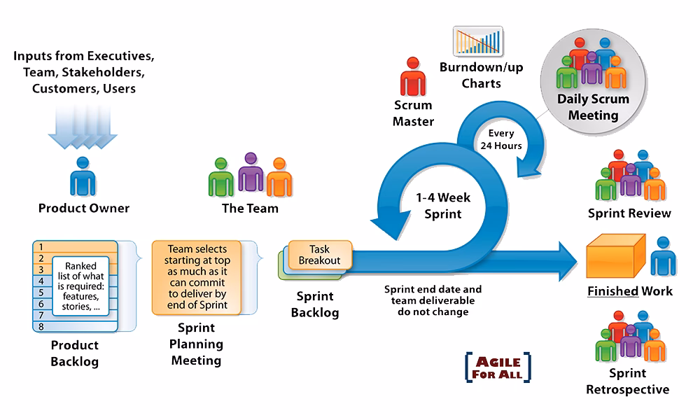 - Sprint Planning (Planificación del Sprint): Al inicio de cada sprint, el equipo Scrum se reúne para planificar el trabajo a realizar. El Scrum Master ayuda a asegurar que el evento se lleve a cabo y que el equipo entienda el propósito de la planificación, facilitando la comunicación entre el Propietario de Producto (que presenta los elementos priorizados del Product Backlog) y el Equipo de Desarrollo (que determina cuánto trabajo puede completar y cómo lo hará).
