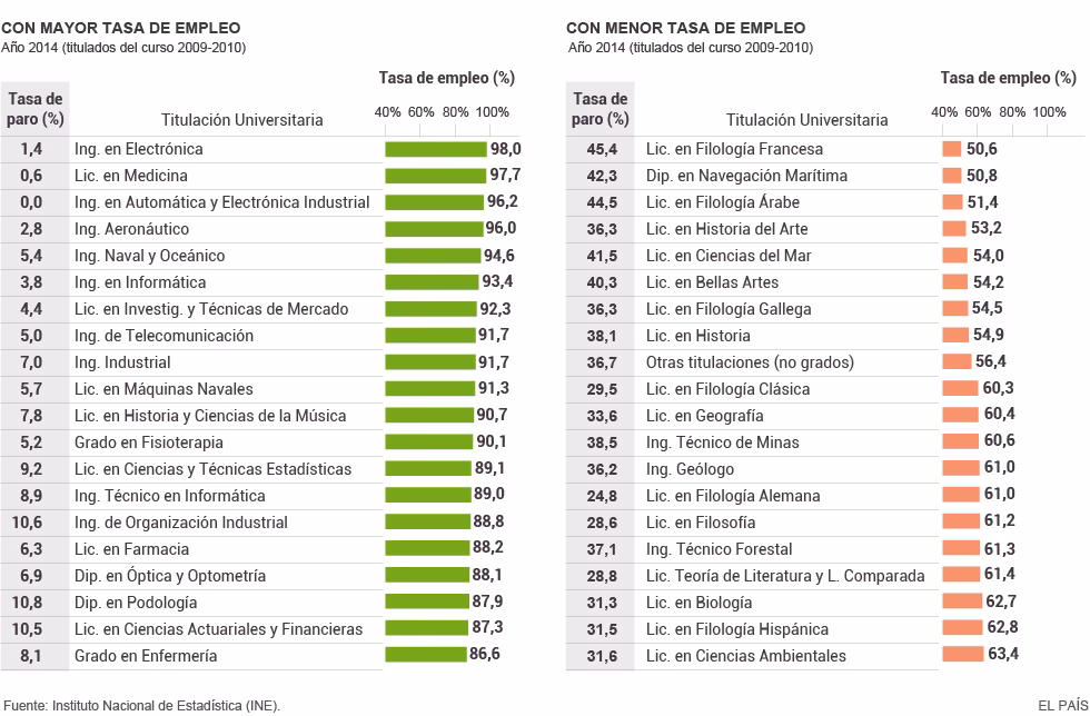 Históricamente, según datos de 2019, carreras de Humanidades como Filosofía o Literatura, y áreas específicas dentro de otras ramas (como Conservación y Restauración o ciertas Ingenierías muy específicas), presentaban tasas de paro más elevadas.