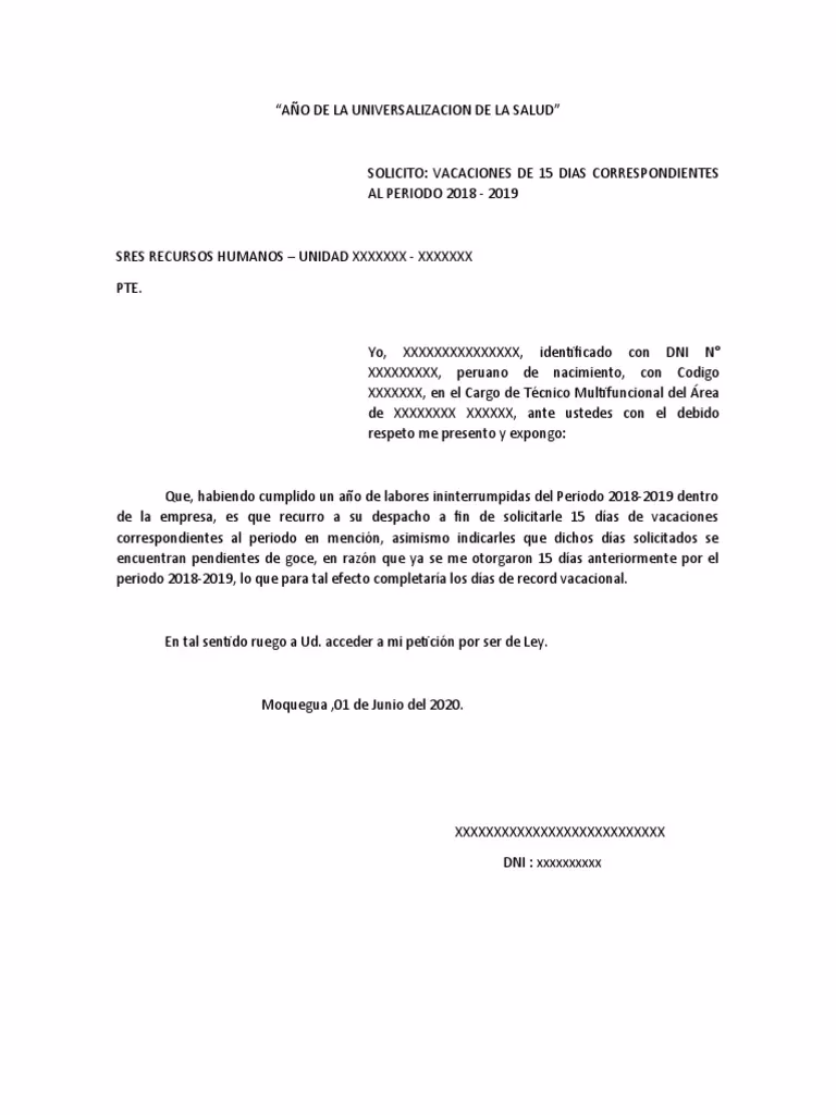 Estimado [destinatario], Mediante la presente carta, me dirijo a usted para informarle sobre mi solicitud de [X] días de vacaciones del [X] al [X] de [mes que corresponda], de acuerdo con el período vacacional correspondiente al año actual. Mi fecha de reincorporación a la actividad laboral será el día [X].