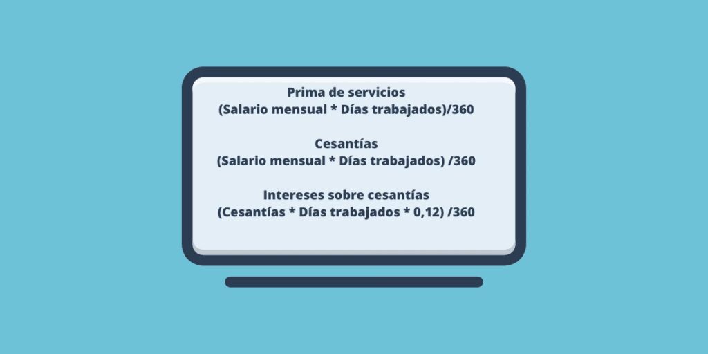 La fórmula es: (Salario base de liquidación X Días totales transcurridos) / 360.