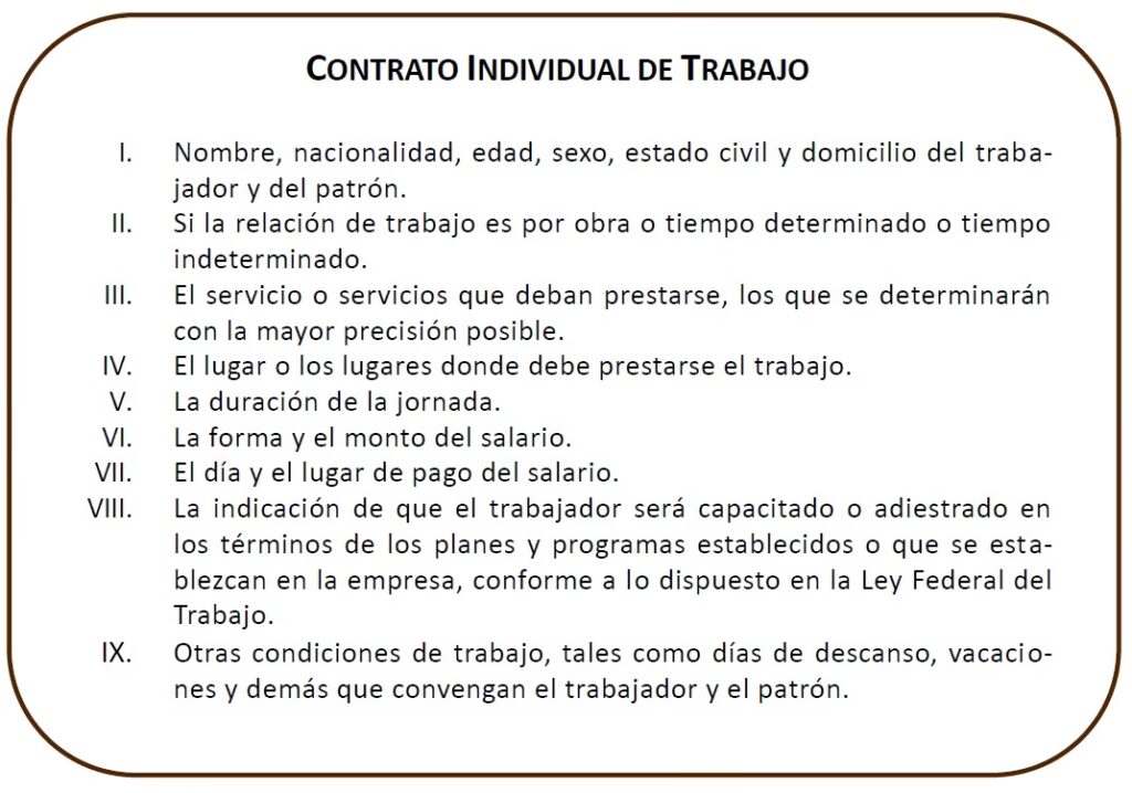 La Ley Federal del Trabajo es clara respecto a los elementos mínimos que un contrato individual de trabajo debe incluir para ser válido y completo. Estos son: