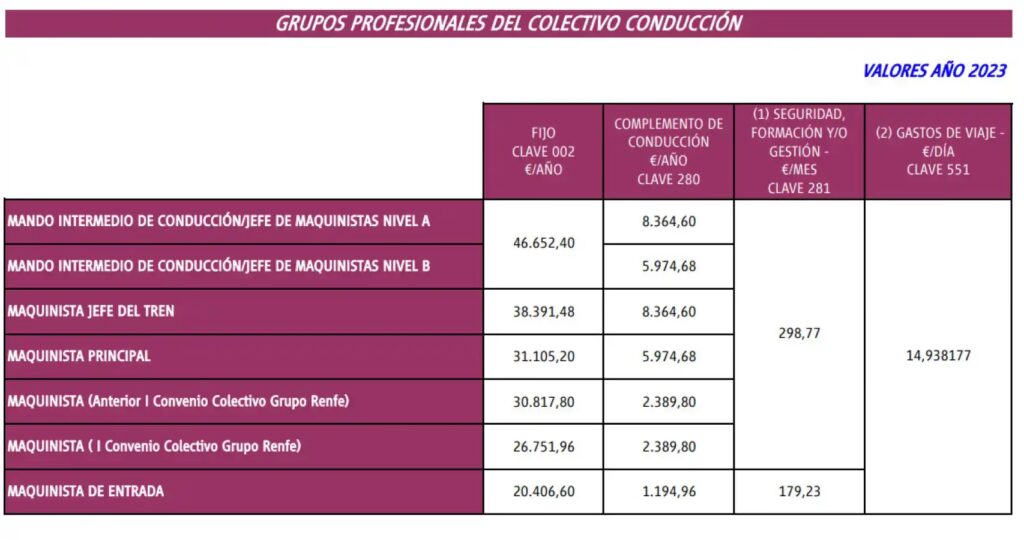 La categoría más alta es la de Jefe de Maquinistas, con un salario base anual de 48.049,68 euros, que puede incrementarse significativamente con los complementos.