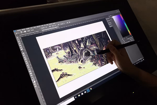 Un ordenador o tableta potente, una tableta gráfica (Wacom, Huion, XP-Pen, iPad con Apple Pencil), y software como Adobe Photoshop, Adobe Illustrator, Procreate, Clip Studio Paint, o Affinity Designer son herramientas estándar en la industria digital.