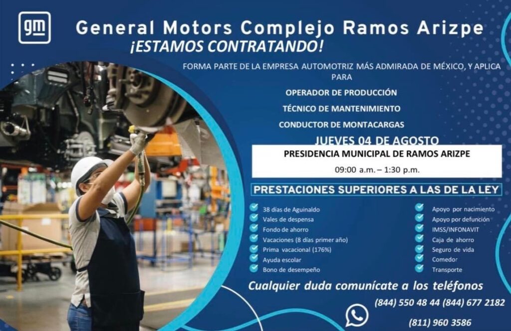 - Beneficios: Descuentos en autos GM, seguro de vida y dental, tiempo libre pagado.