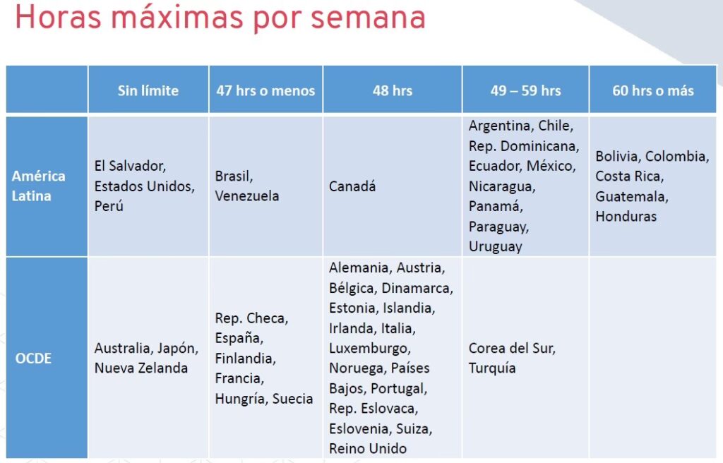 La duración máxima depende del tipo de jornada: 8 horas diarias para la jornada diurna (44 semanales), 6 horas diarias para la jornada nocturna (36 semanales), y 7 horas diarias para la jornada mixta (42 semanales), a menos que más de 3 horas sean nocturnas, en cuyo caso se considera nocturna.