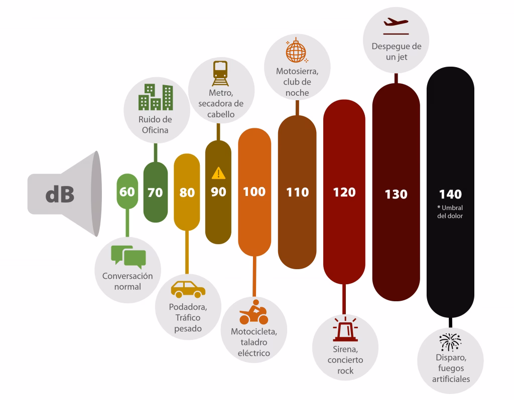 Además, la normativa establece un nivel máximo de presión sonora para ruido de impacto o impulso (sonidos muy cortos y fuertes, como golpes o explosiones). Este nivel no debe exceder los 140 dBA pico bajo ninguna circunstancia.