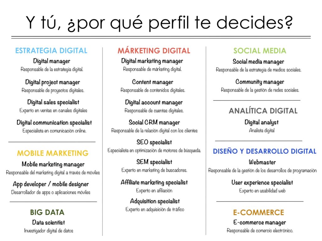 Estos son solo algunos de los roles más destacados. El campo también incluye especialistas en análisis digital, expertos en email marketing, diseñadores UX/UI con enfoque en conversión, y muchos otros, reflejando la diversidad y especialización que requiere este sector.