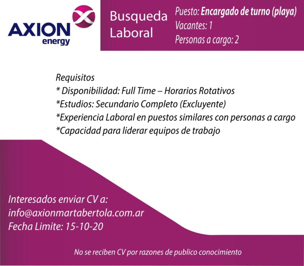 Plataformas de búsqueda de empleo populares en la región (como LinkedIn, Bumeran, ZonaJobs, Computrabajo, entre otras) suelen ser utilizadas por Axion o las consultoras que gestionan sus procesos de selección para difundir sus búsquedas. Configurar alertas con palabras clave como “Axion”, “Estación de Servicio”, “Playero”, “Atención al Cliente Axion”, etc., puede ayudarte a ser de los primeros en enterarte cuando se publica una nueva oferta.