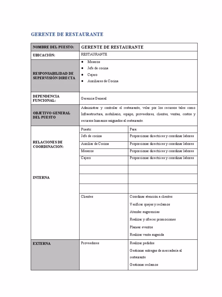 Los gerentes de restaurante, también llamados gerentes generales de restaurante, son personas responsables de supervisar todas las operaciones diarias que se llevan a cabo en un establecimiento de comidas. Es un rol de gran relevancia, ya que garantizan la reputación y la calidad del restaurante a su cargo.Mar 21, 2025