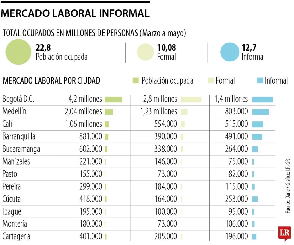 Estos datos recientes se suman a estadísticas previas que ya mostraban la magnitud del fenómeno. Por ejemplo, tomando el promedio anual de los microdatos del DANE en 2024, el 56,4% de los ocupados del país eran informales. Un poco antes, en el trimestre móvil febrero - abril de 2023, la incidencia a nivel nacional era del 58%, indicando que aproximadamente 6 de cada 10 trabajadores carecían de un contrato formal con afiliación a seguridad social.